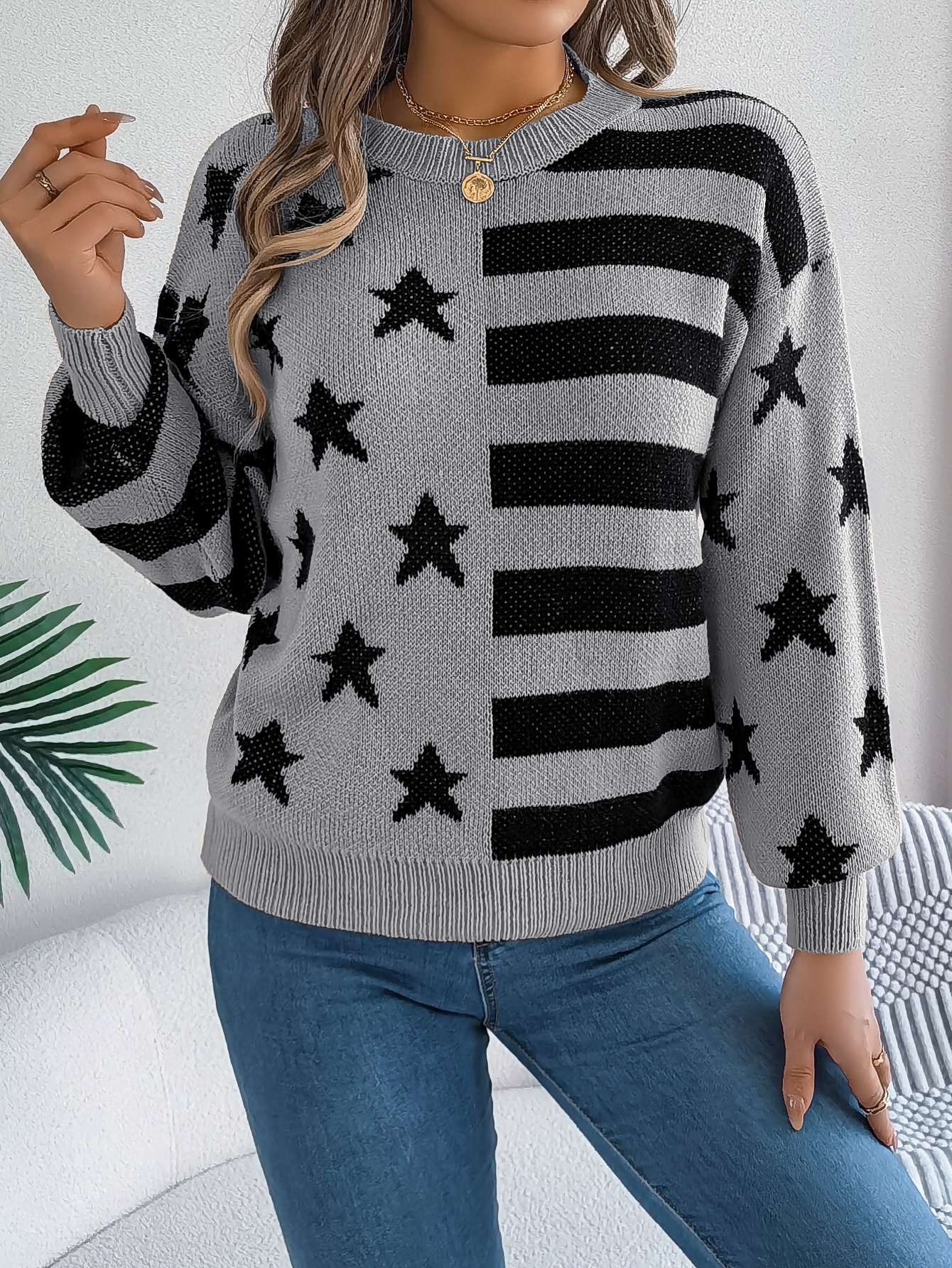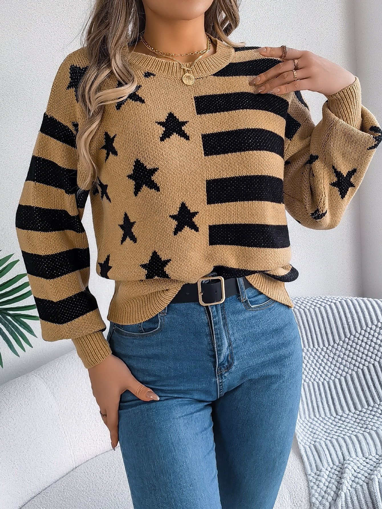 Make a bold statement with this women's star stripe lantern sleeve pullover sweater from Sarah Express. Featuring a striking color blend design with stars and stripes, romantic lantern sleeves, and premium artificial wool construction, this sweater is the perfect fusion of patriotic charm and street fashion edge.
