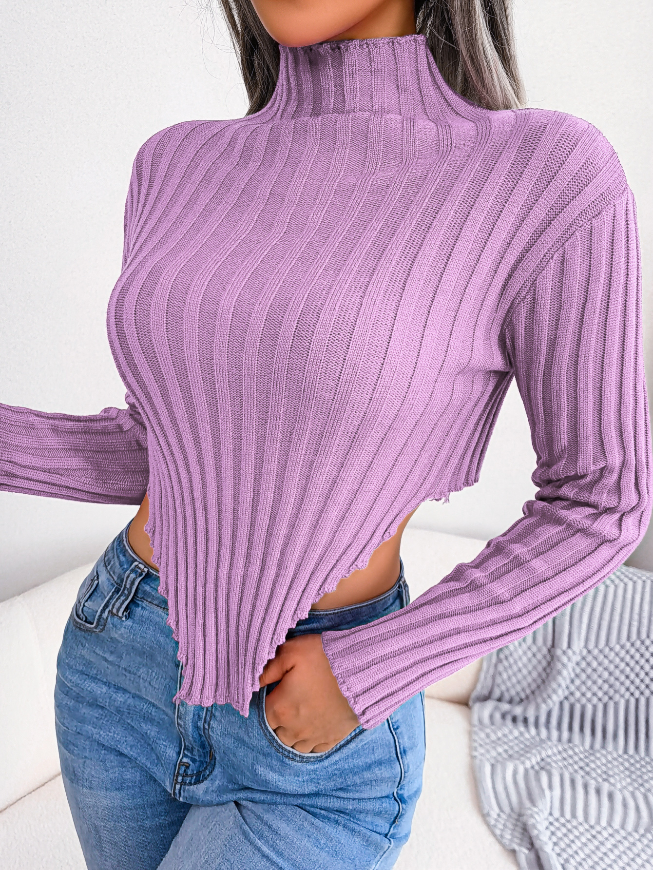 Pair with high-waisted jeans and ankle boots for casual chic, style with a leather skirt and heels for date night, or layer under a blazer with tailored pants for creative office wear. The asymmetric hemline and half turtleneck make this top a versatile statement piece for fall and winter.